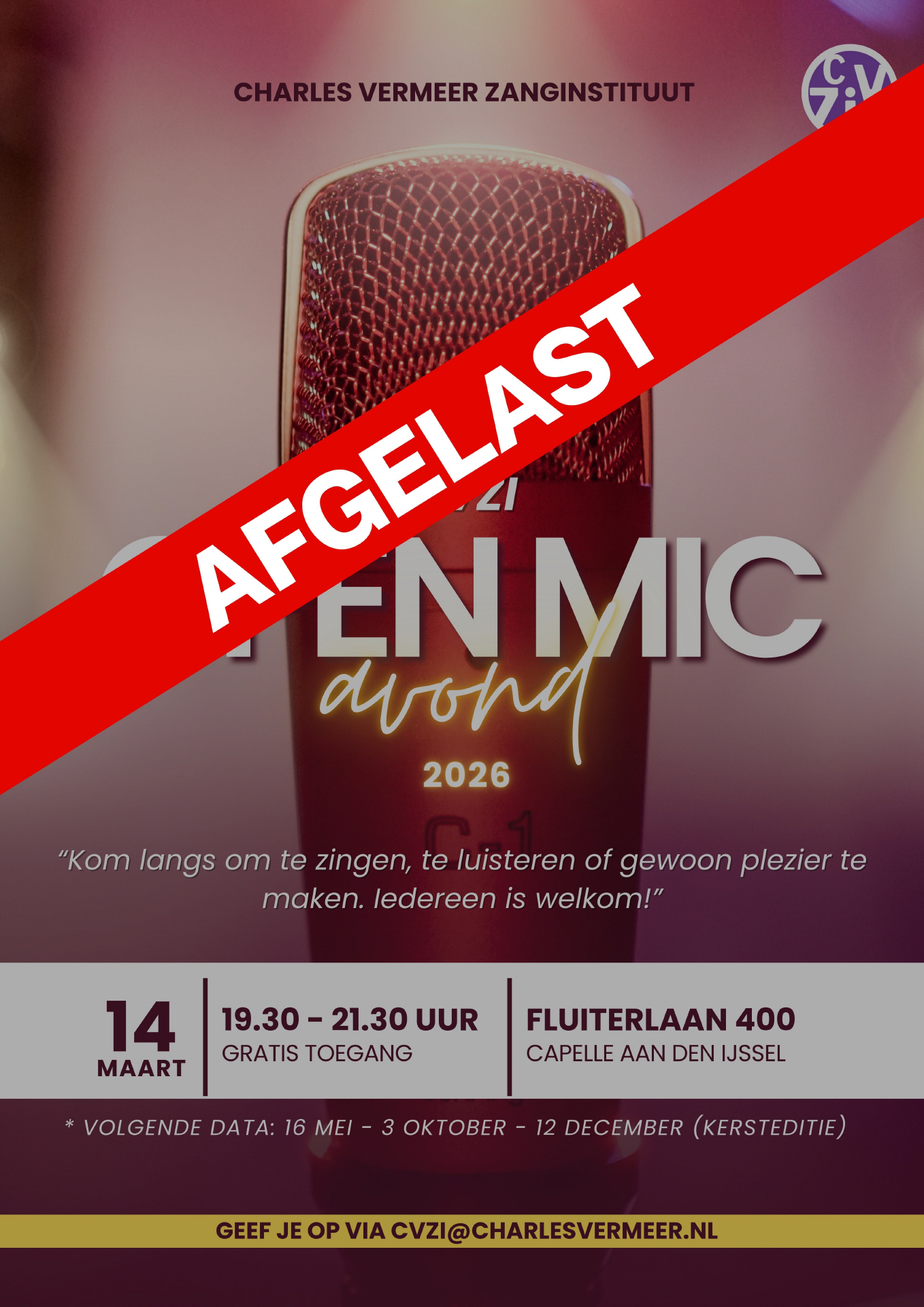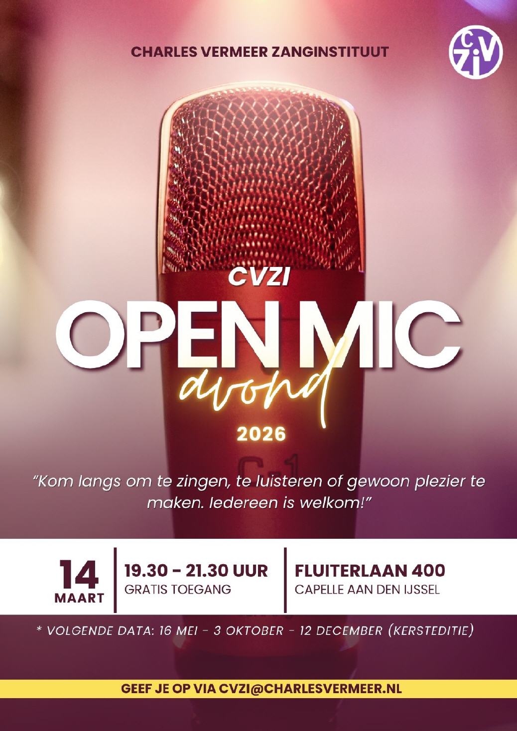 Charles Vermeer Zanginstituut Fluiterlaan 400, 2903 HN Capelle aan den IJssel 010-4422599 of mail naar info@charlesvermeer.nl